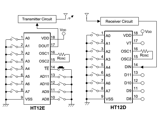 Thankfully Holtek corps has provided a great pair of Encoder and Decoder ICs that are HT12D and HT12E. There are 8 address and 4 data pins for each of them.