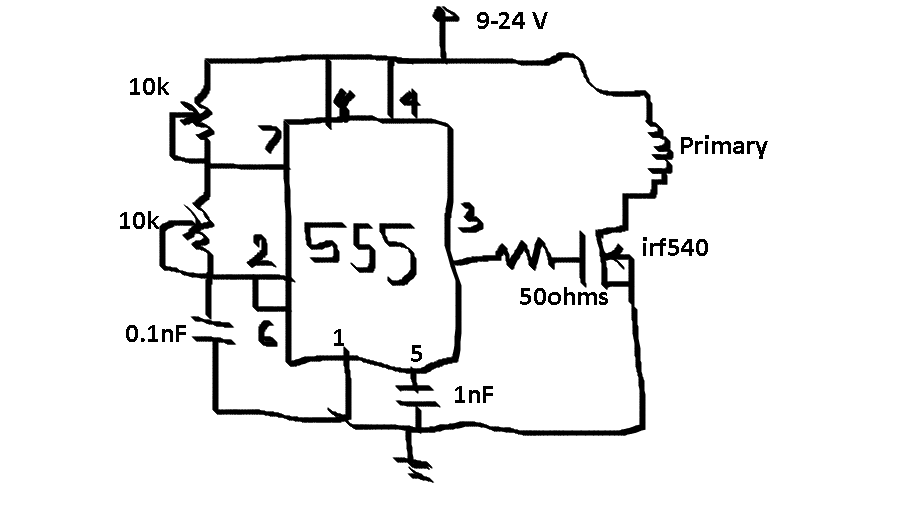 Now you need to give that primary an alternating supply, which will be stepped up to give heavy voltages. for that we will need following things
