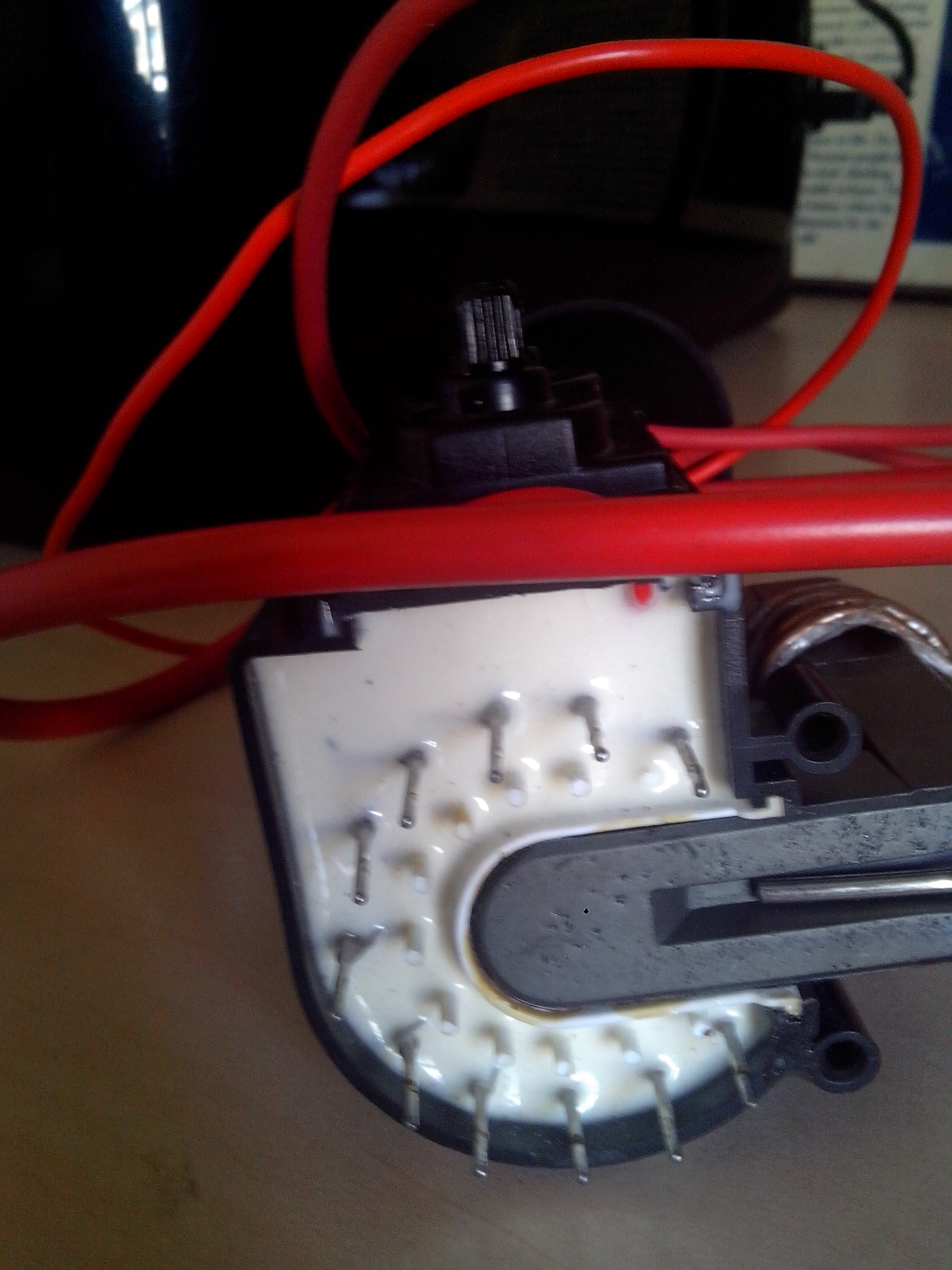 Now the step 0 is to identify the pins of this flyback. All of these have 10-11 pins from these you have to take out the 3 that are Primary(+), Primary(-) and High voltage ground. The high voltage output comes from that suction cup thing as you can see in the pics.
