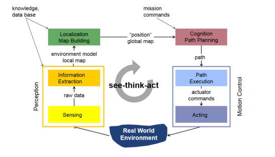 First article will be dedicated for recognizing the street signs. The car will be moving around without any human control so first let us cover the safety mechanisms. In the figure below, we can see an autonomous mobile robot system representation by Roland Siegwart. This is the generic model we are going to use to represent our systems.