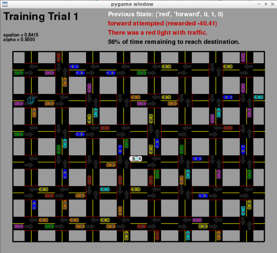 The 1st trial shows a random action with epsilon as high as 0.85. The actions are random and it can be seen that the car is penalized because of the wrong action it has taken.