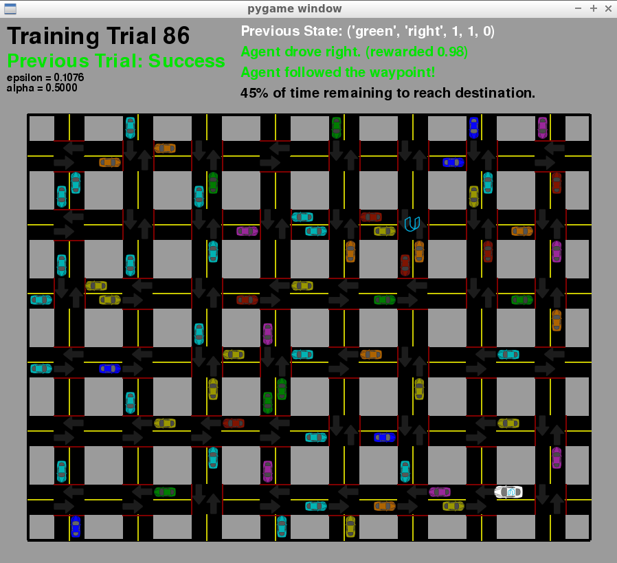 By the time it is 86th trial, the epsilon has been reduced to 0.1 and the actions are more determined by the previously explored Q-values. For the state that is green light with the waypoint pointing rightwards it drives to right perfectly.